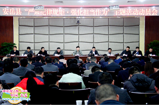 2019年3月22日,安岳县召开“严肃纪律规矩·强化担当作为”主题活动动员会,深入贯彻习近平新时代中国特色社会主义思想和党的十九大精神,全面落实省委、市委从严管党治党决策部署,教育引导全县各级领导干部特别是“关键少数”严肃纪律规矩、强化担当作为,进一步把全面从严治党推向纵深,奋力开创成渝中部开放发展前沿区发展新征程。