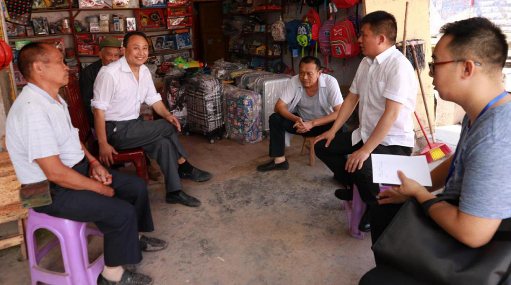 在瑞云乡,谢良勇查看了居民门户前是否张贴《致全县人民群众的一封公开信》和联系服务群众卡,并寻问当地群众有没有干部入户开展走访,有没有向他们宣传解释政策,张贴联系服务群众卡后有没有介绍卡的用途。