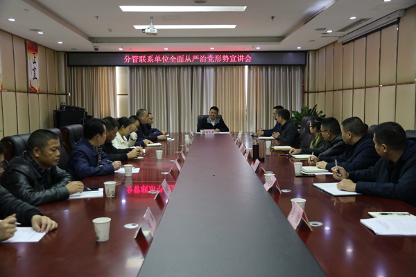 会上,谢良勇对分管联系单位作了全面从严治党形势宣讲。指出,全面从严治党形势严峻任重道远,必须坚定不移贯彻落实“严”的主基调;客观认识当前特别政治生态,在汲取深刻教训中持续修复坚定信心;认真落实管党治党主体责任,持之以恒把全面从严治党延伸到基层。