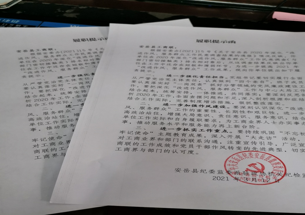 日前,安岳县纪委监委派驻政协机关纪检监察组就“改进作风、服务群众”工作向综合监督单位发出的履职提示函。