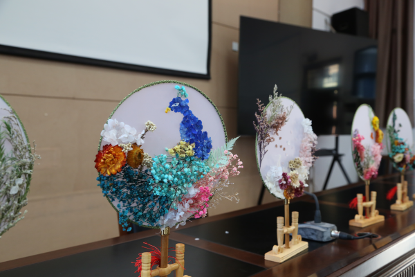 活动现场,工作人员向大家介绍了团扇的传统文化背景,详细为大家介绍了团扇制作的具体过程,讲解干花粘贴的技巧及方法,用提前准备的干花和空白团扇,结合自己的创意,制作一把春意十足,春花摇曳的团扇。在工作人员的指导下,大家互相交流、互相观摩,充分发挥想象力、创造力,添加了自己特别的创意,形成了独一无二的作品。